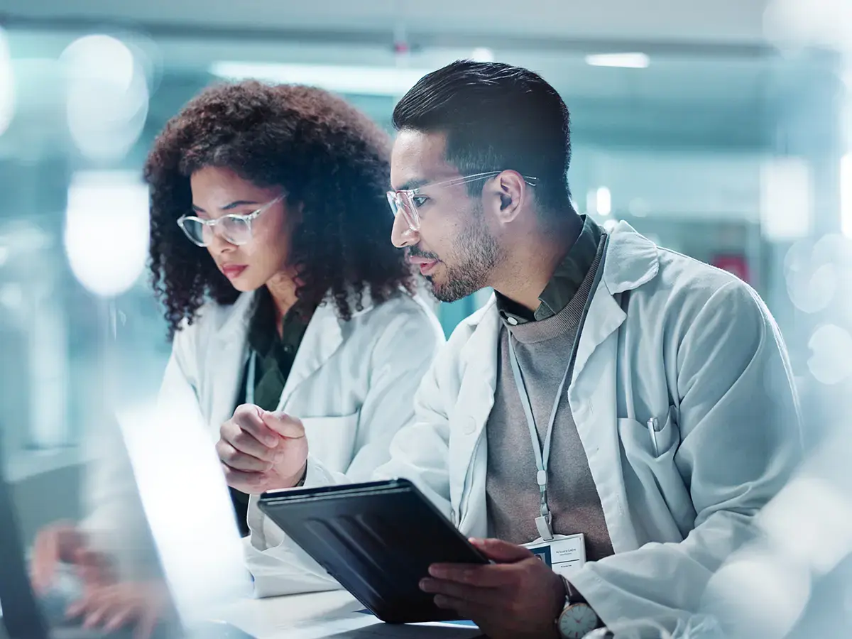 Green checkmark and "Trusted Nationwide" text above a map of the United States Close-up of medical equipment in a hospital, featuring tubes and gauges under blue lighting, conveying a clinical and sterile environment A technician in a clean room suit, mask, and goggles operates equipment in a sterile lab Two scientists in white lab coats focus on data on a tablet in a bright laboratory